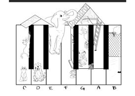 Grandma's Animals is the first song I sing and play with my students during their first piano lesson. It's a duet, where the student learns to play the treble clef notes with either hand, while the teacher plays the bass and sings the words. It starts off by students knocking 6 times on the piano. The words of the song cue the student on which notes to play. The song is written with the picture of the piano keyboard and the two "houses"on the piano, in mind: The Dog House, and Grandma's House. Students learn the key names by relating the picture of the Cat, Dog, Elephant, Front door, Grandma, Attic, and Backdoor to the keys they play. It gets students playing on the very first day, and teaches a 6/8 rhythm, too!