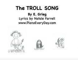 The Troll Song is for beginning piano students. The song is written in Middle C position and uses Edvard Grieg's Hall of the Mountain King theme. Students can repeat the song in every octave in increasing tempi starting from the lowest range and the slowest tempo to the highest octave and the fastest speed. The lyrics are about different trolls that do different things at different speeds. The song introduces tempo markings like Largo, Adagio, Andante, Moderato, Allegro, Presto and Prestissimo.