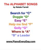 The Alphabet Songs by Natale Farrell are seven songs to be taught by rote for beginning piano students or can be read by older students who still struggle with learning the key names. Students really know where each key is by their letter names after learning these fun short songs! The lyrics are easy to learn and the songs use both the black and white keys nearby the main note. Teachers can decide if they want to introduce using different finger numbers for repeating notes next to each other.